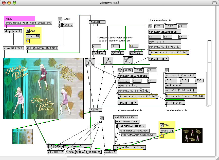 for the 2nd excercise, I just allowed the color channels to be played with a bit. I used some switch objects so that you can, for example, take the stream from the red channel and have it display as the blue channel. I also added some formulas in patcher objects like in tutorial #2, which change the output levels of each color channel independently. I was thinking about having these also update in real time like the movie itself, but found that when I put a metro on them MAX got reallly bogged down. maybe thats why Doug was talking about using YUV color in his video project.