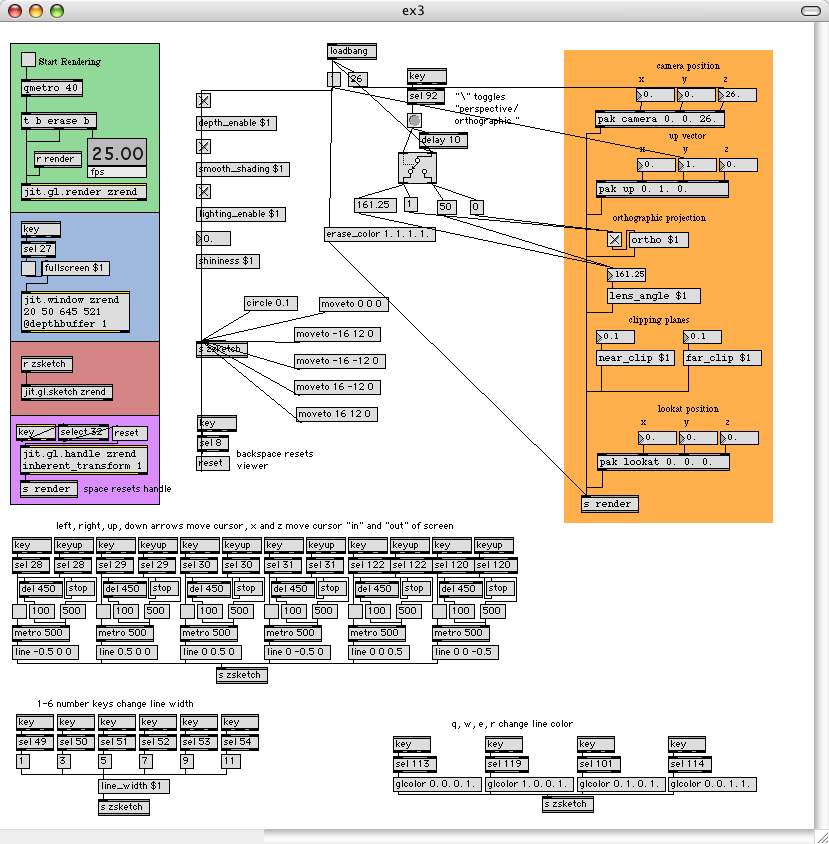for my OpenGL exercise I made a little drawing tool of sorts. You can draw little line segments around the screen in 3 dimensions (arrow keys move cardinal directions, and x and z move “in” and “out” of the screen). I used a combination of key, keyup, metro, and delay to incorporate a delayed key-repeat function so you can draw by holding down the keys. You can also change the color of the line by using the q (black), w (red), e (green), and r (blue) keys. The 1-6 number keys change the line thickness from 1 to 11. If you click in the center of the screen where the line starts, the handle tool is on so you can rotate the screen in 3 dimensions to view your line drawing. The space bar resets the view to default. The \ key switches between orthographic and perspective projection (with the default set to orthographic). And lastly, the backspace/delete key erases the drawing and moves the cursor back to the center of the screen.